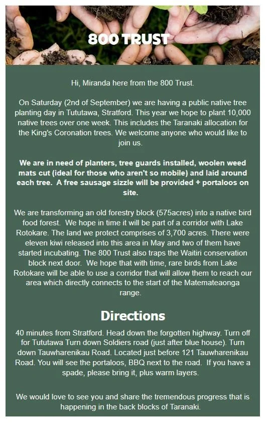 800 Trust is transforming the old Tututawa forest into a bird forest. This area is actively trapped. Already fernbird and the native falcon live in this area. BBQ (sausages) provided. Please let us know if you are vegetarian. Portaloo at site.