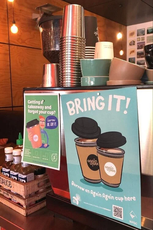 NPDC is funding cafes that want to join Again Again until 31st March. So have a chat with your favourite cafés about Again Again, or about offering a discount for bringing your own cup, and refer them to the Bring It website.