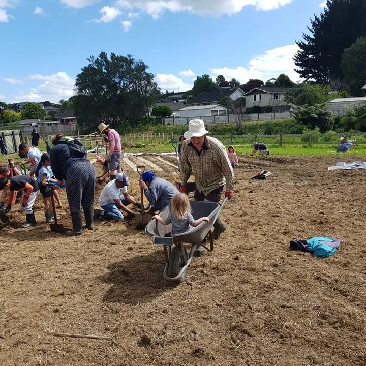 Steve pushing Aria in the wheel barrow as many hands make light work, amongst the laughter and neighbourly aroha. This was taken at the 22nd November Hui at Marfell Community Garden.
