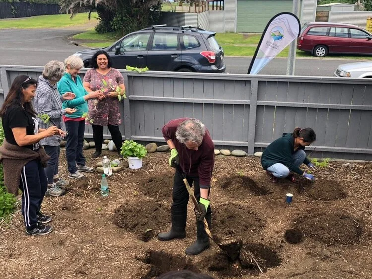 Getting started with your maara kai workshop in Waitara held in November 2020. Participants are learning how to plant kumaras.