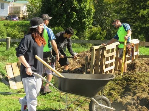 Every Thursday, the ZEAL composting team, Te Reinga Rangiwai, Kanye Taipiri, and Caesar Davis meet at the Māra (garden) to make compost. Using a technique called lasagne layering, the students use the correct ratio of greens to browns. For every bucket of food waste, two buckets of sawdust or shredded paper or cardboard are layered on top.