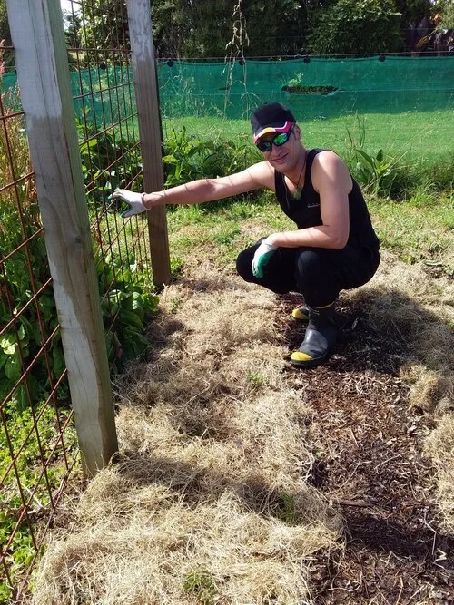 Horticulture student, Joe preparing beds this winter under the bean and pea tower fence.