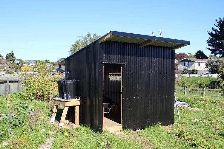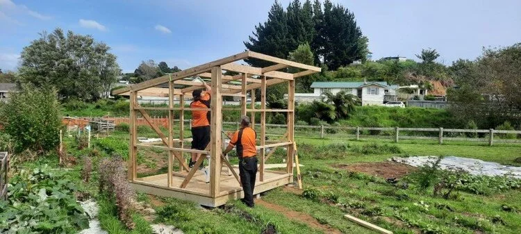 The garden shed was a collaborative effort, designed by one of the volunteers, Andrew French, then built by Mitre 10 team member Phil Southall, and the Mitre 10 Trade team. Andrew also donated a Corokia hedge, feijoa trees, and a mulberry, as well as the decorative shed door. Local roofer, Jamie Rogers, donated the roofing iron and fixed the cladding, roof, and gutters to the shed. He also supplied a water collection system connected to the downpipes.