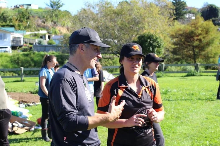 Rebecca from Mitre 10 and Steve from Sustainable Taranaki at the Marfell Community Garden Roof Shout