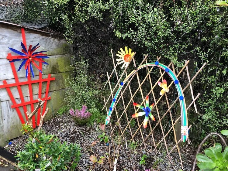 Sophie ( 6 years) turned some recyclables into, a rainbow, pot of gold, cat, toadstool, flowers, bird & butterfly — which lended to a busy morning. She couldn’t resist bringing the rainbow home! Once home, she didn’t stop and more crafting ensued, turning our plastic bottles into flowers to put with her rainbow in the garden.