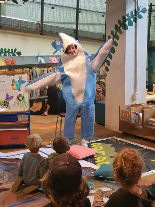 Brittany dressed as shark to celebrate Seaweek with the children at Crackerjacks -Puke Ariki Library