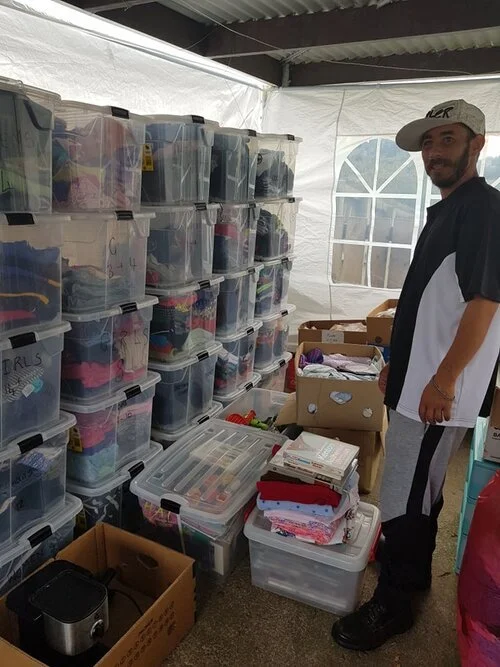 Volunteer, Daniel, helping to organise the library of clothing bins, separated by size and type.