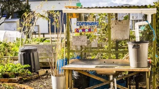 There are many raised garden beds, a collection point for composting materials, a community pantry, rainwater collection tanks and a variety of veges.
