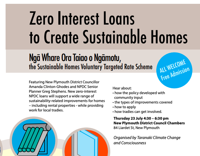 Learn More: Zero Interest Loans to Create Sustainable Homes - Thursday 23 July 4:30 – 6:30 pm, New Plymouth District Council Chambers, 84 Liardet St, New Plymouth. Free, all welcome.